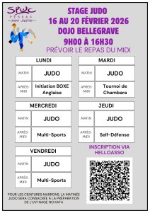 Bonjour à tous. Nous organiserons un stage durant les vacances du mois de Février, du lundi 16 Février au Vendredi 20 Février de 9h00 à 16h30 au DOJO. Le prix du stage est de 20€ par jour (réduction de 20€ si vous optez pour la formule 5 jours). Pensez à fournir le repas du midi. Je vous adresse le lien pour vous inscrire et le programme du Stage.